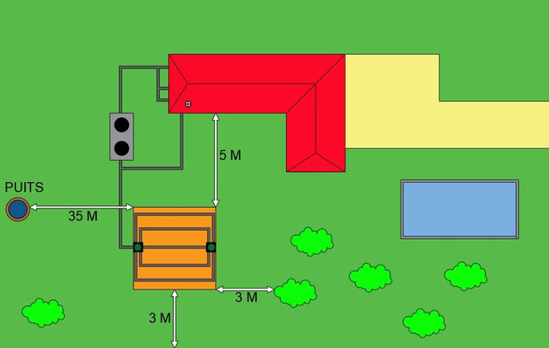 Dans un premier temps, il est crucial de déterminer la zone de terrain disponible pour l'installation du dispositif de traitement, en tenant compte des règles d'implantation ainsi que des éventuels projets futurs, tels que la construction d'une piscine ou d'un garage, ou encore des espaces destinés à être végétalisés (plantation d'arbres). En effet, la zone dédiée au système de traitement ne peut être imperméabilisée, utilisée pour la circulation, ou plantée de végétation à système racinaire développé. Les règles d'implantation sont les suivantes :