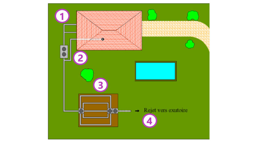 Une installation d'assainissement non collectif se compose de plusieurs dispositifs assurant quatre étapes essentielles :